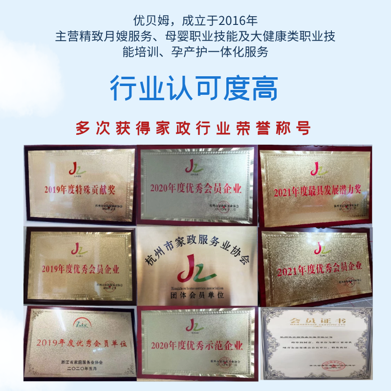 杭州優(yōu)貝姆健康管理有限公司,成立于2016年,是一家致力于打造集定制居家月嫂服務、孕產護一體化服務、母嬰健康管理培訓學校為一體的現代化母嬰健康管理企業。 連續(xù)多年被浙江省家政協會及杭州市家政協會評為:“優(yōu)秀會員單位”“家政示范企業”“特殊貢獻獎”等殊榮。 多次在浙江省家政技能比賽中獲得優(yōu)異成績,并代表浙江省參加“長三角家政技能大賽”并取得優(yōu)異成績。